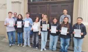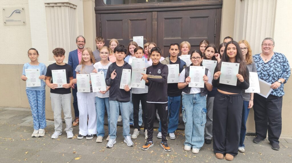 Auch bei den telc-Prüfungen auf den Niveaustufen A2–B1 und B1–B2 erreichten die zehn teilnehmenden Schülerinnen und Schüler der ehemaligen Jahrgangsstufen 7, 9 und 10 fast durchweg das jeweils höhere Niveau. Bei der Prüfungsvorbereitung wurden sie tatkräftig unterstützt von den Englischlehrkräften Leon Sprenger und Anja Zimmermann. Schulleiter Marius Kehrmann überreichte den erfolgreichen Teilnehmerinnen und Teilnehmern die Urkunden und gratulierte zu den starken Ergebnissen. Ein Dank gilt zudem dem Förderverein des FHG, der die Eltern bei den Prüfungsgebühren beider Prüfungen finanziell unterstützte.