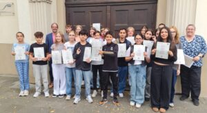 In der Cambridge-„Flyers“-Prüfung überzeugten alle 22 Teilnehmenden aus den ehemaligen 6. Klassen mit sehr guten Leistungen, die auch von den Prüfern des Englischen Instituts in Köln explizit gelobt wurden. Der Prüfungstag war wegen der großen Hitze eine besondere Herausforderung. Trotzdem überzeugten die Teilnehmerinnen und Teilnehmer auch in den mündlichen Prüfungen, vor denen sie laut AG-Leiterin Ulrike Hänsler-Stieldorf am meisten „Bammel hatten“.