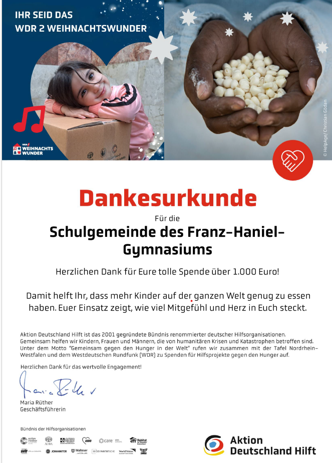 Durch die Unterstützung der gesamten Schulgemeinde, seien es die Schüler, das Lehrerkollegium oder die Eltern, gelang es der Schülervertretung (SV), insgesamt 856,69€ für den guten Zweck zu sammeln. Dieser Betrag wurde von unserer Schülervertretung (SV) auf 1000€ erhöht. Die Spende wurde an die Benefizaktion des WDR 2 übergeben und trägt dazu bei, Menschen mit bewegenden Schicksalen zu unterstützen.